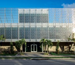 The aluminum veil curtain wall system on the west side features a custom leaf pattern.