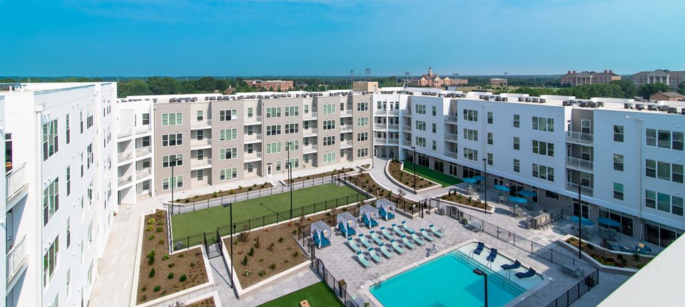 Vida is a 280-unit apartment complex and mixed-use facility located near Charlotte in Kannapolis, North Carolina. It consists of 4-and 5-story wood frame buildings and a 2-story cast-in-place concrete parking structure that can accommodate up to 406 cars. Amenities include a bike storage room, saltwater pool, indoor/outdoor fitness center, clubhouse, and lounge. The mixed-use development also features 20,000 SF of retail space. This project is part of a greater redevelopment of the City’s downtown historic district.